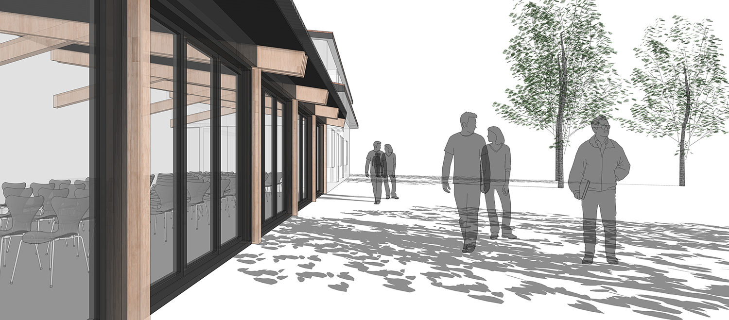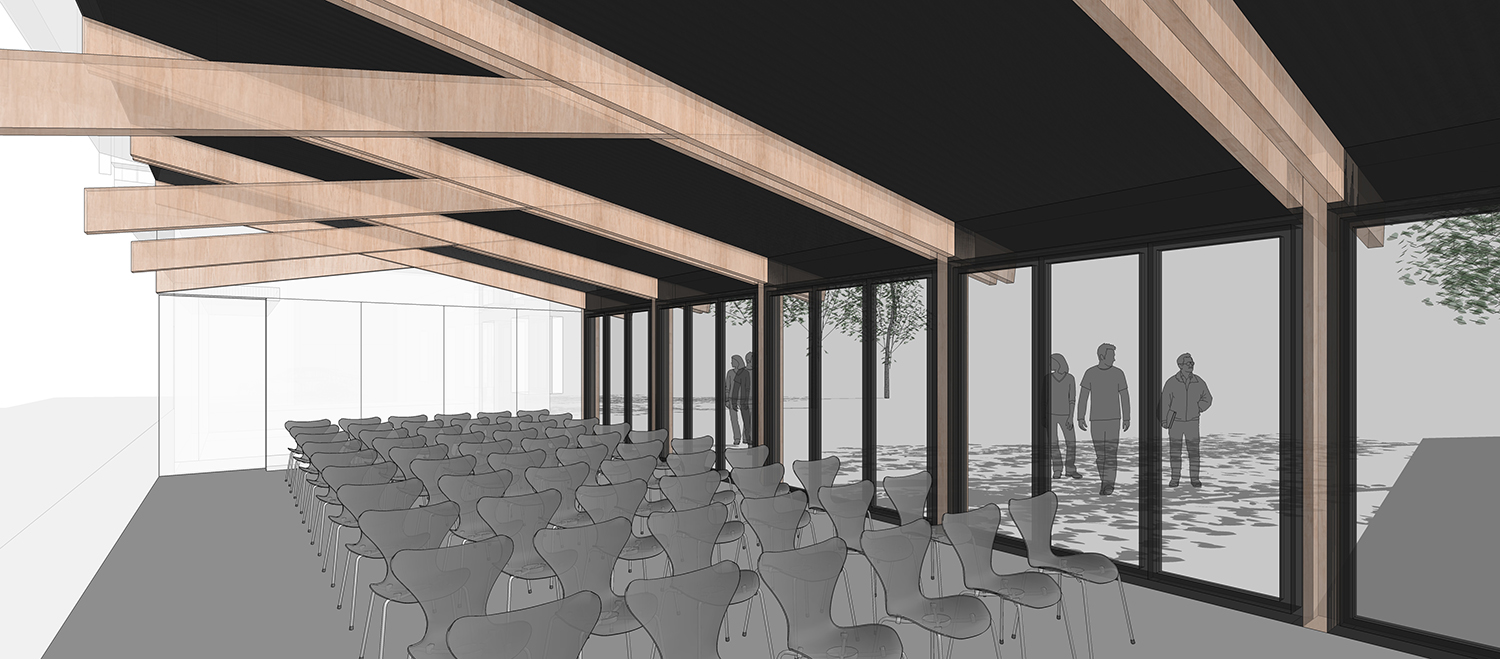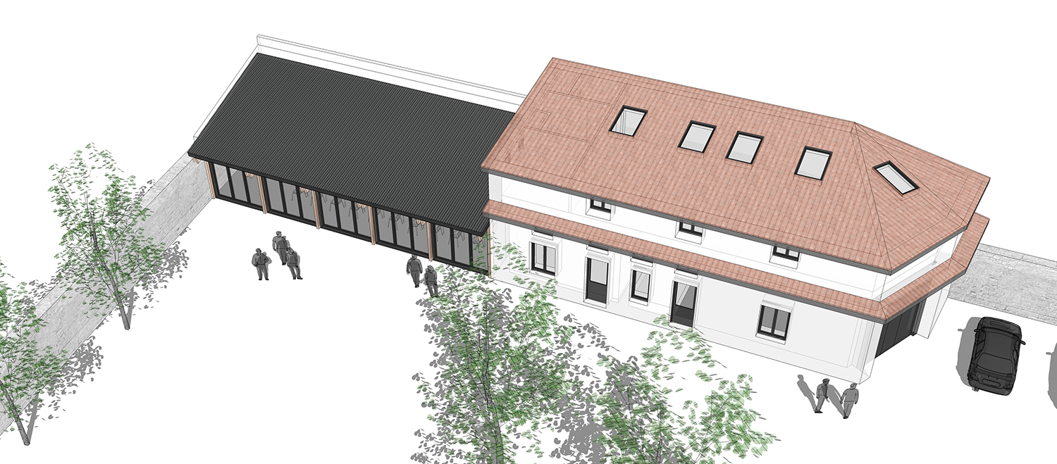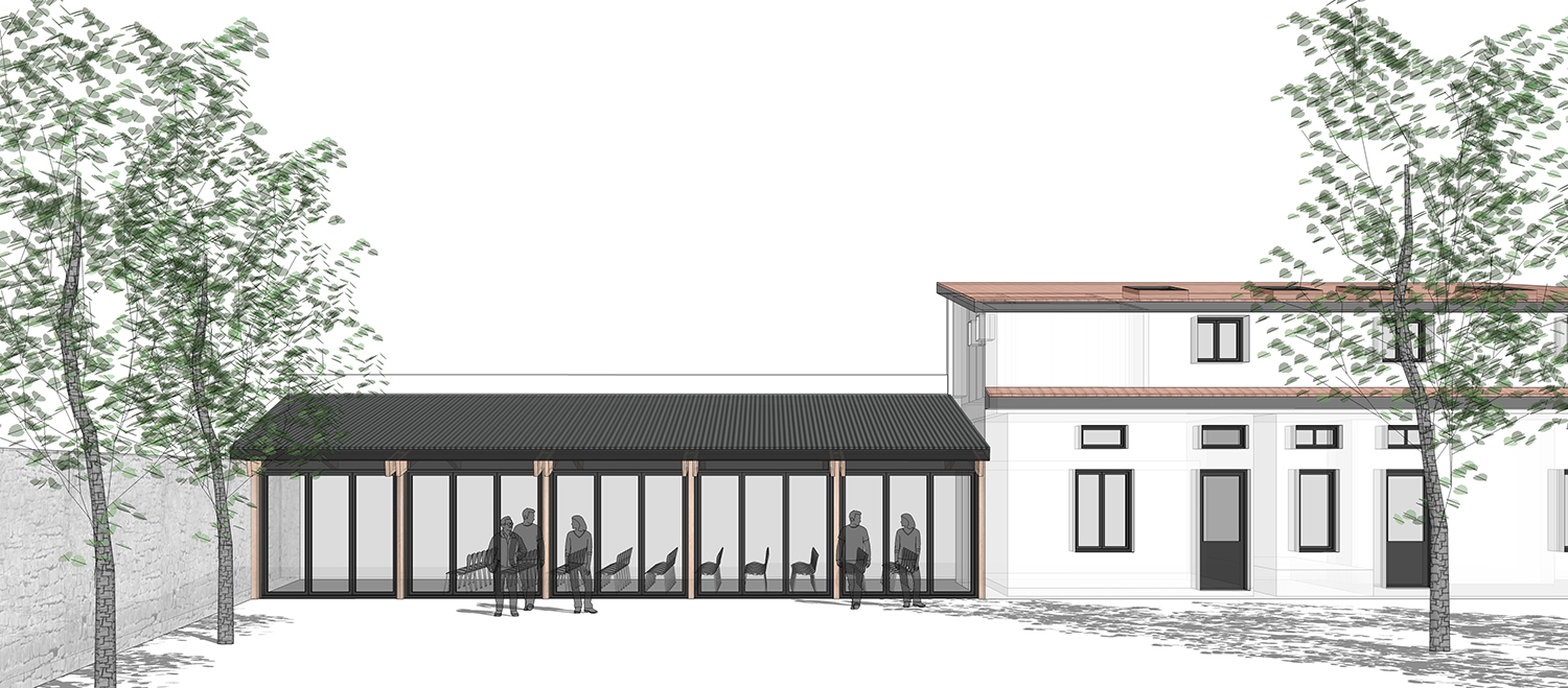 La intervención se completará con la reforma de los edificios anexos dentro de la propiedad. La función de estos nuevos espacios, que superan los 300 m2, será diversificar la actividad y atender la demanda de realización de cursos, talleres, jornadas o eventos. Para ello se reformarán las dos plantas del edificio anexo y se renovará completamente el actual almacén, convirtiéndolo en un aula diáfana con estructura vista de madera y grandes aberturas al jardín.
