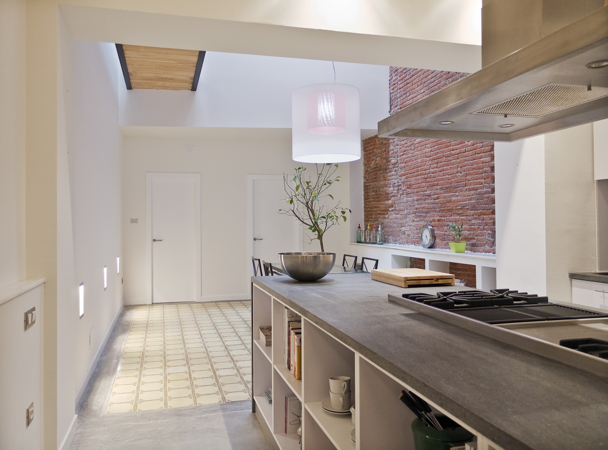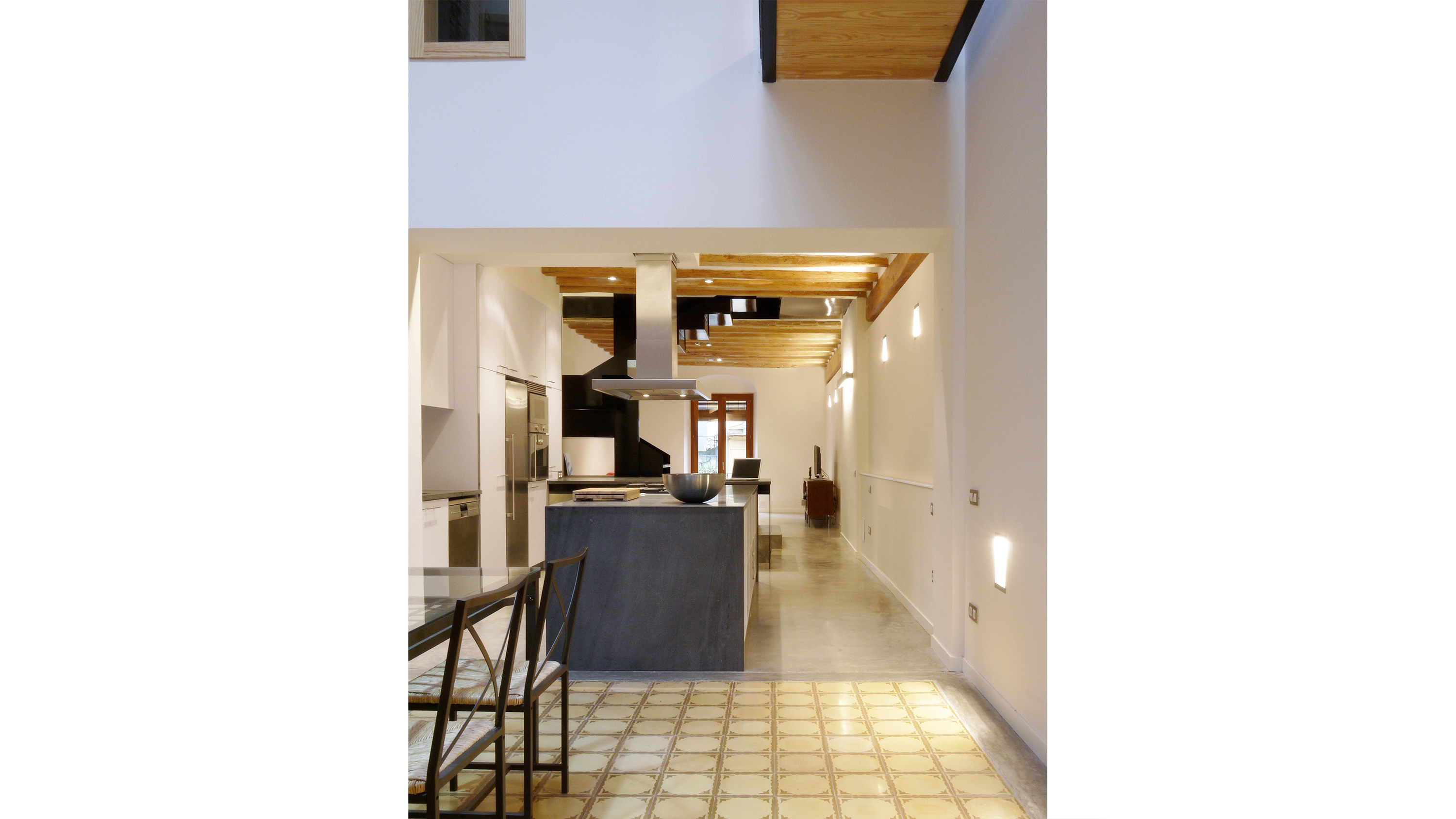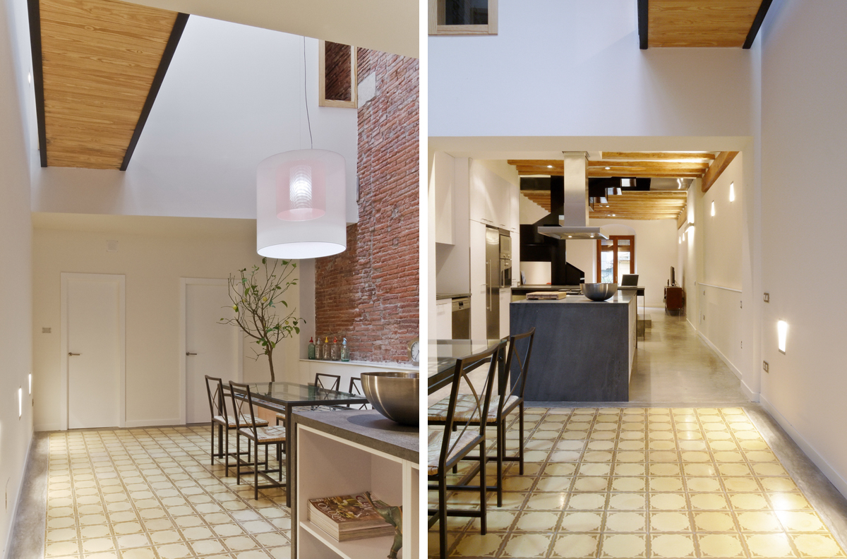 Con el derribo de los tabiques de la planta primera y la nueva configuración de la cubierta, la casa tiene como elemento vertebrador el espacio continuo que agrupa todos los usos de día: salón, cocina y comedor, y que se expande verticalmente hacia el lucernario de la cubierta.