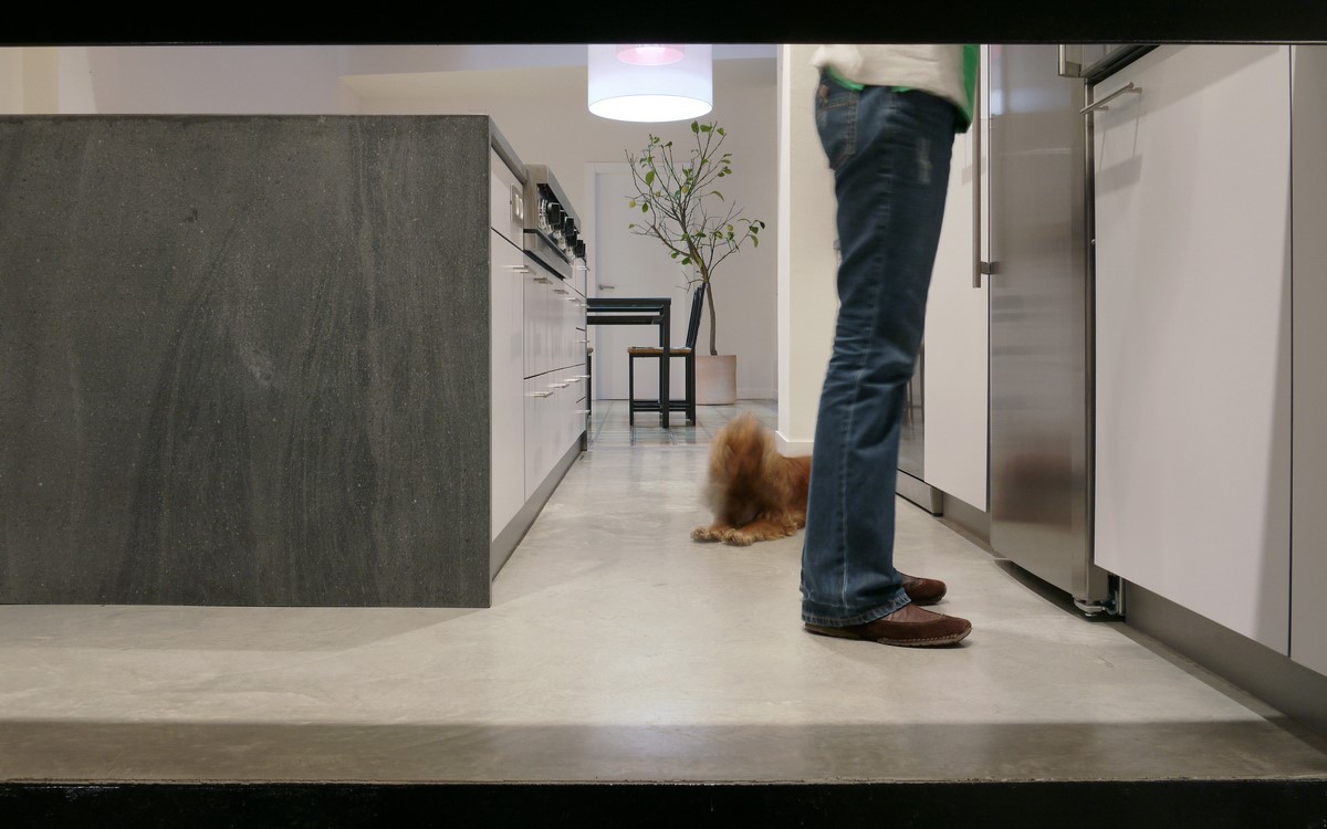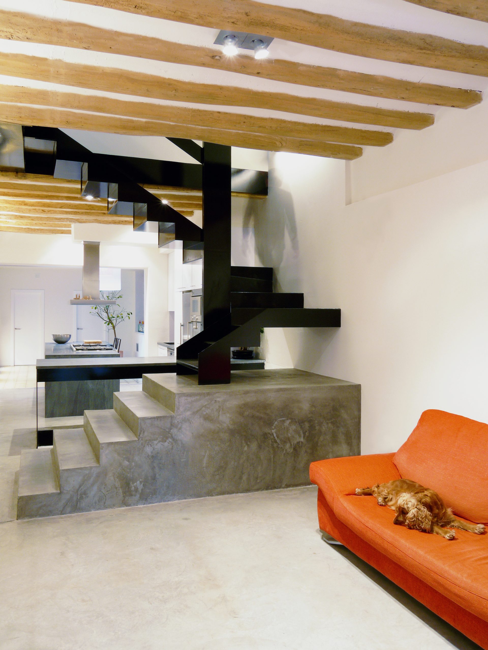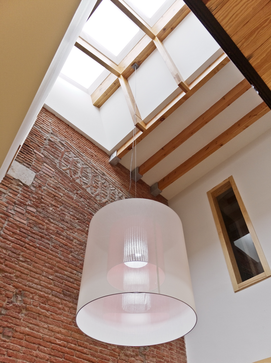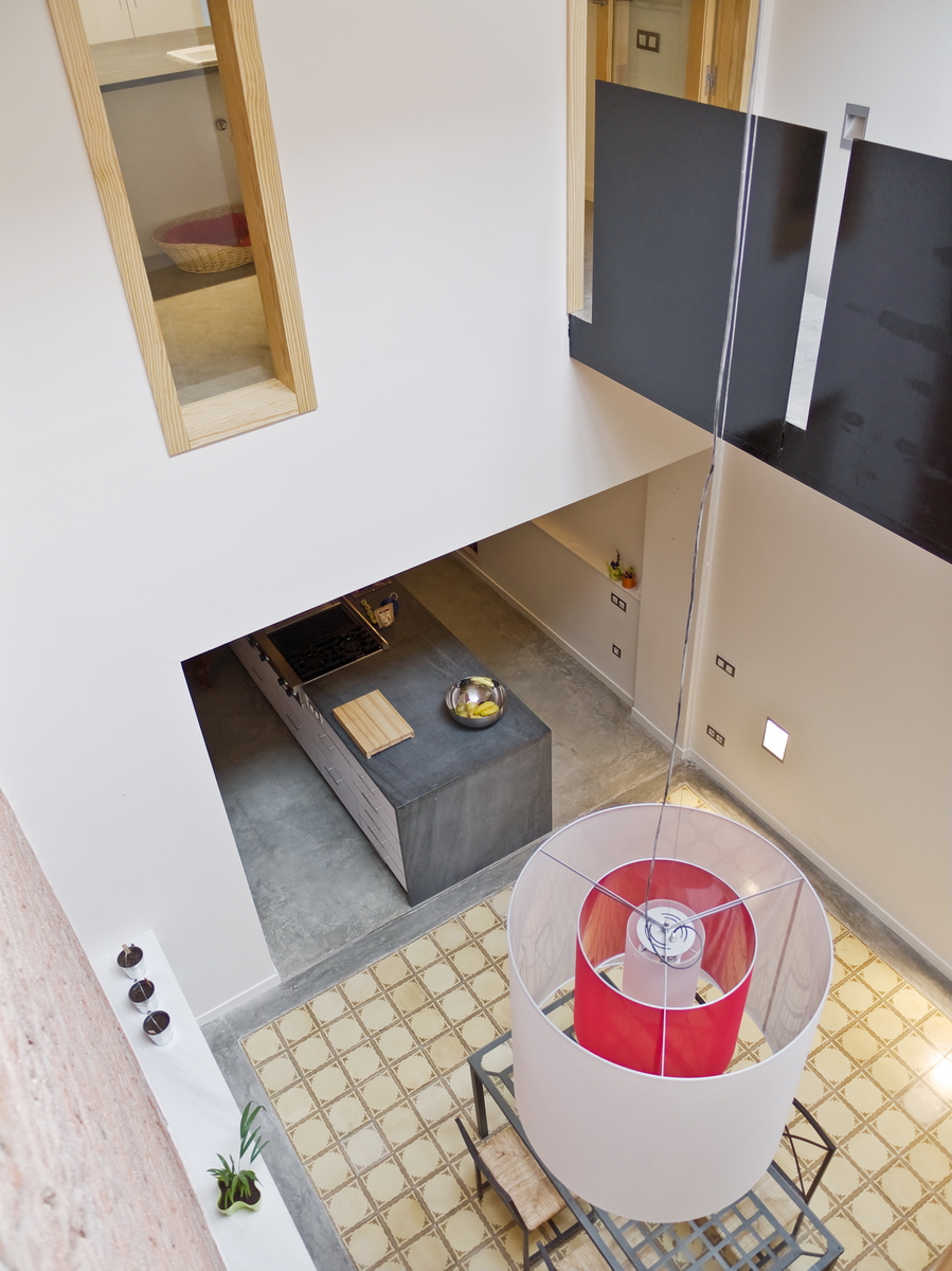 Con el derribo de los tabiques de la planta primera y la nueva configuración de la cubierta, la casa tiene como elemento vertebrador el espacio continuo que agrupa todos los usos de día: salón, cocina y comedor, y que se expande verticalmente hacia el lucernario de la cubierta.