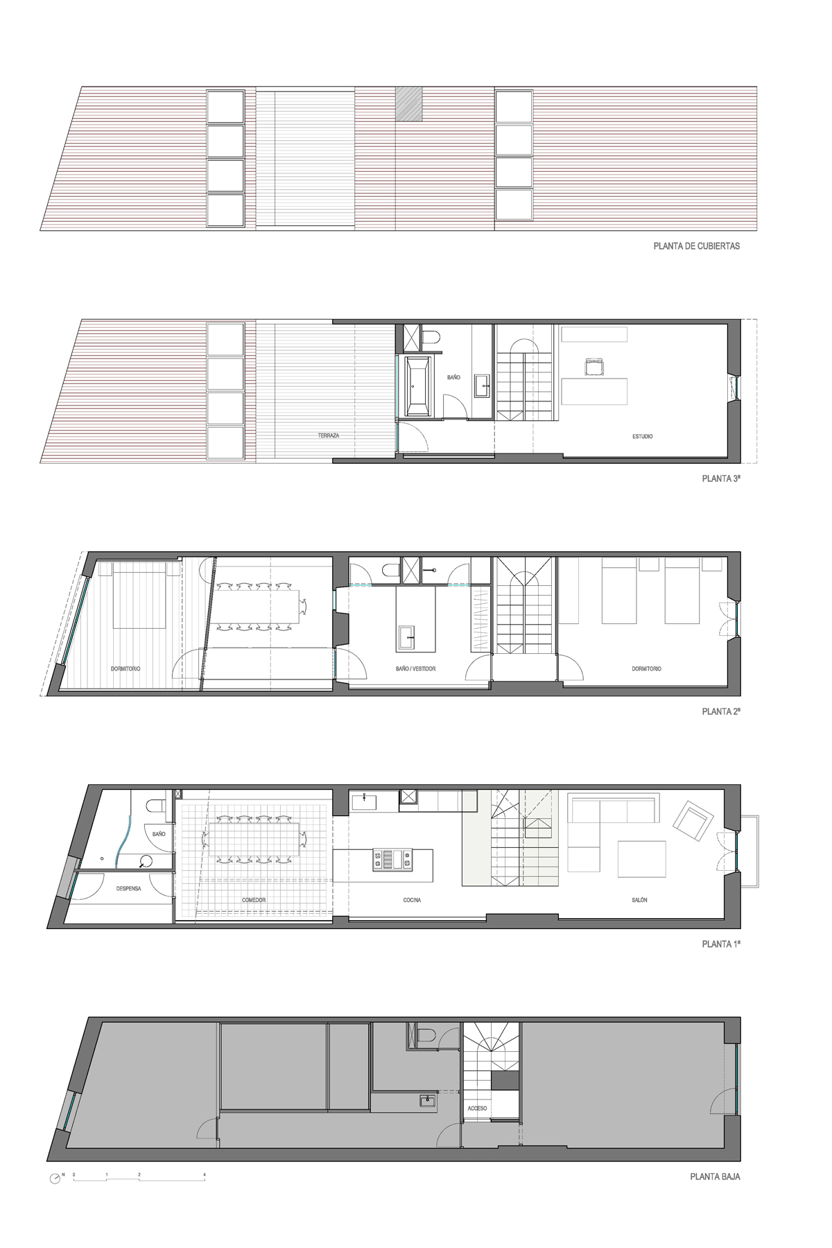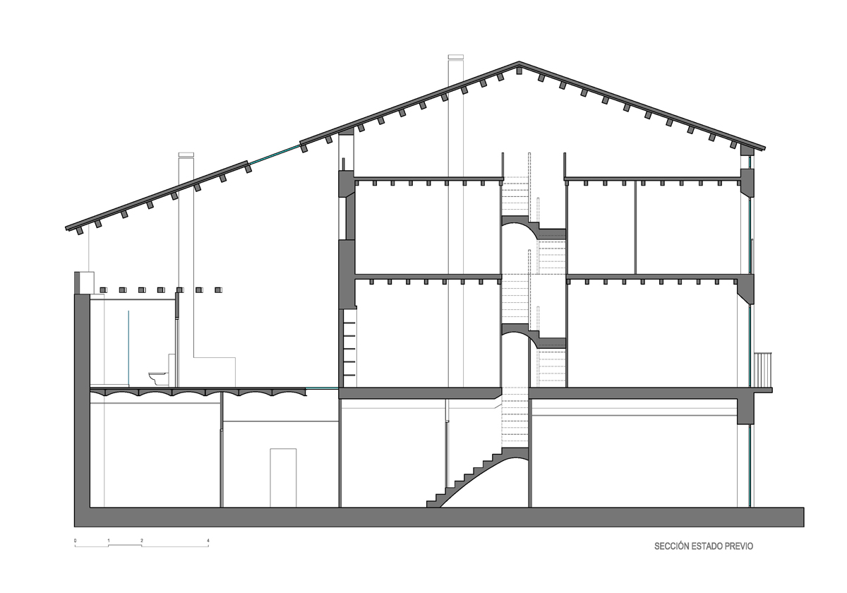 Los clientes querían convertir en vivienda las plantas superiores de este edificio, encima del negocio familiar. Se encuentra en una parcela en el centro de la localidad, entre medianeras, larga y estrecha, con apenas 4 m. de anchura interior libre.