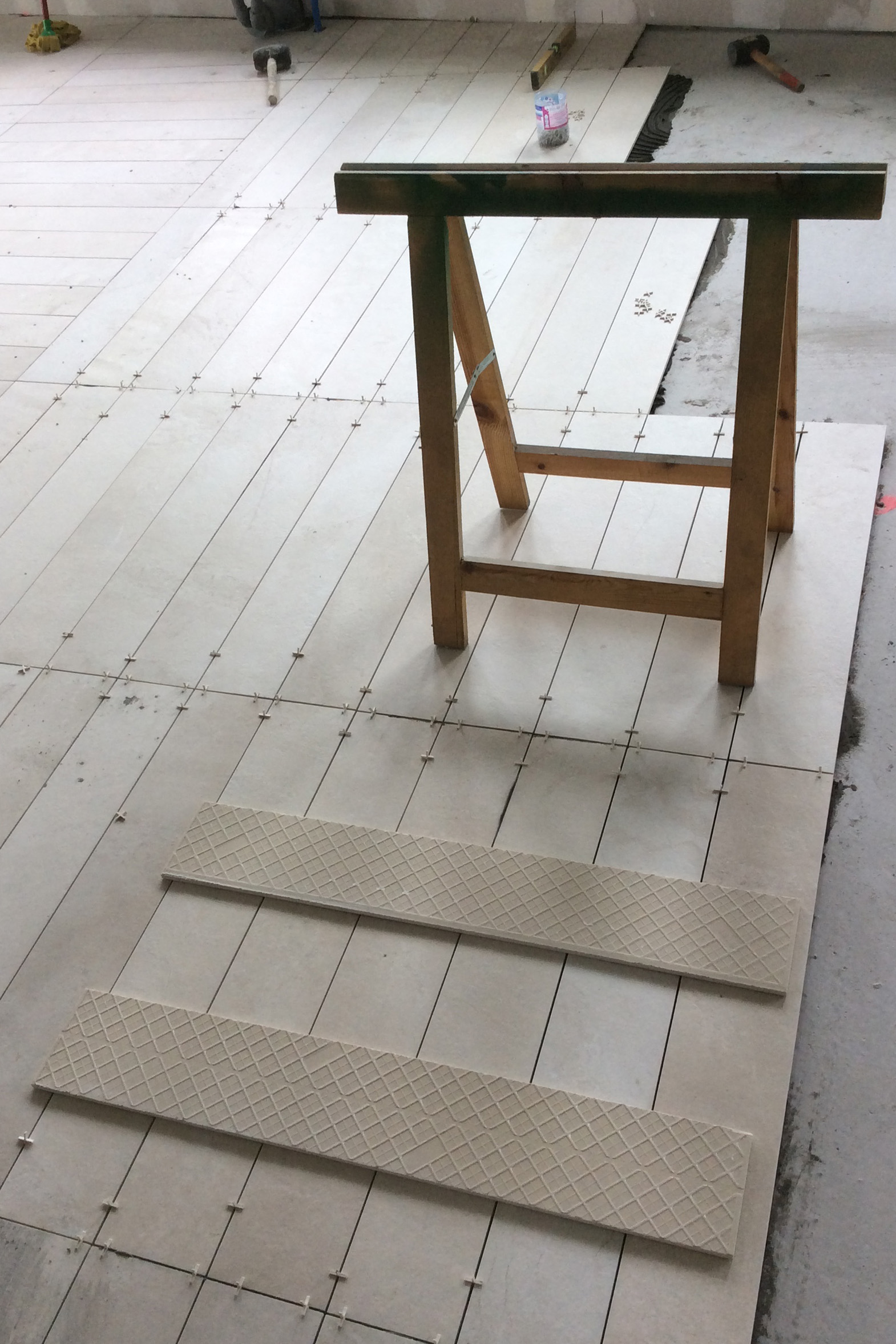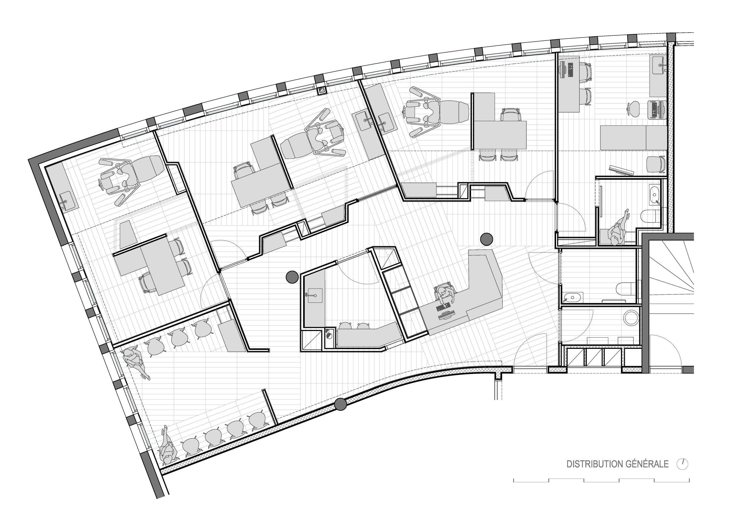 A partir de la geometría irregular del perímetro del local, con una fachada completamente curva, se estableció una trama geométrica según dos direcciones principales, oblicuas entre sí, y trasladada a la colocación del pavimento, que sirvió para definir la distribución.