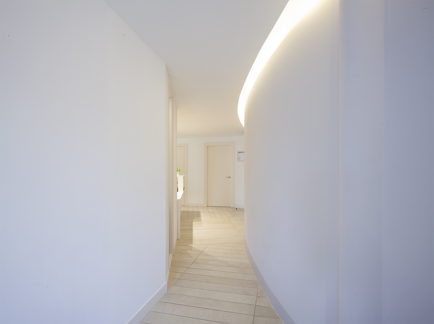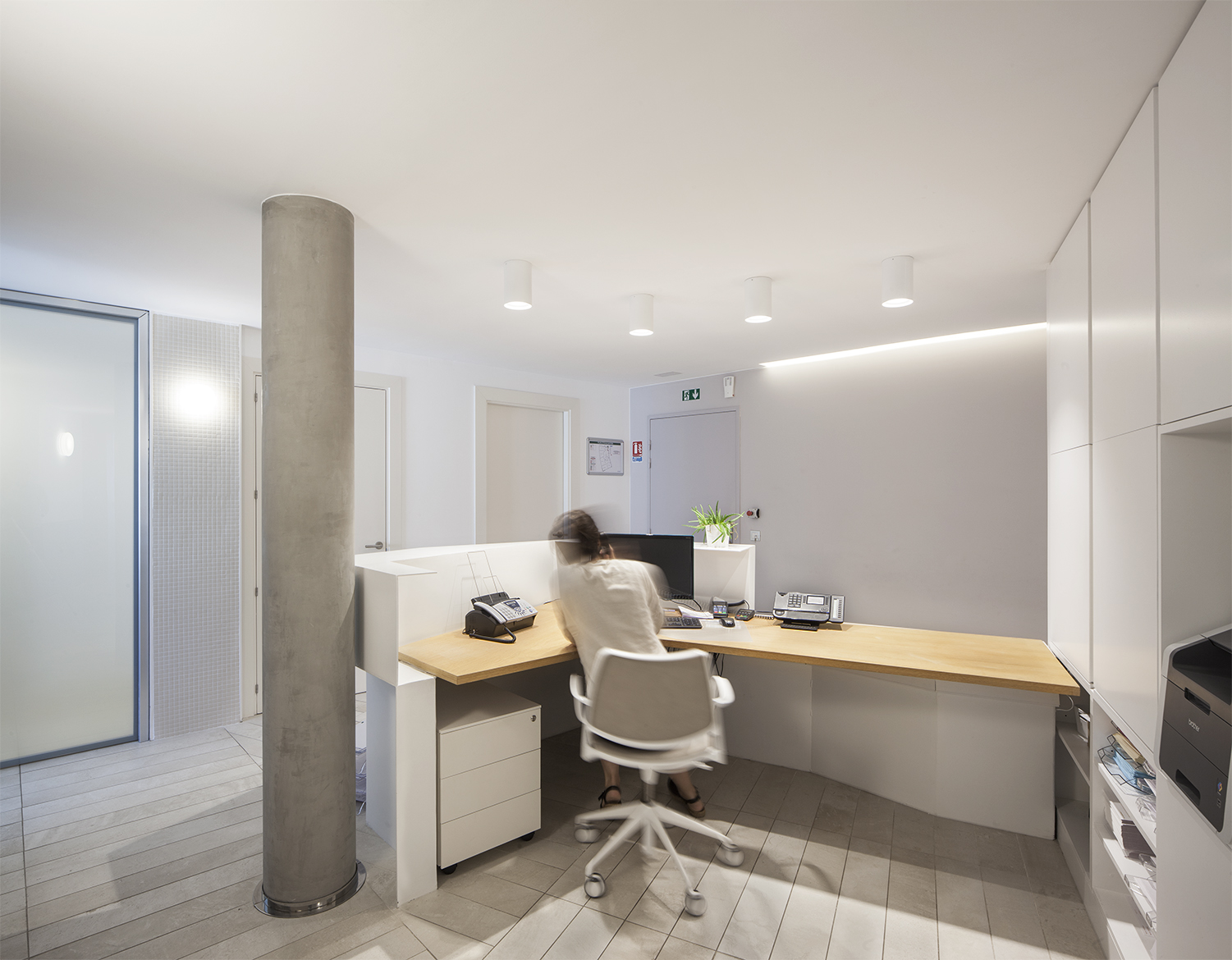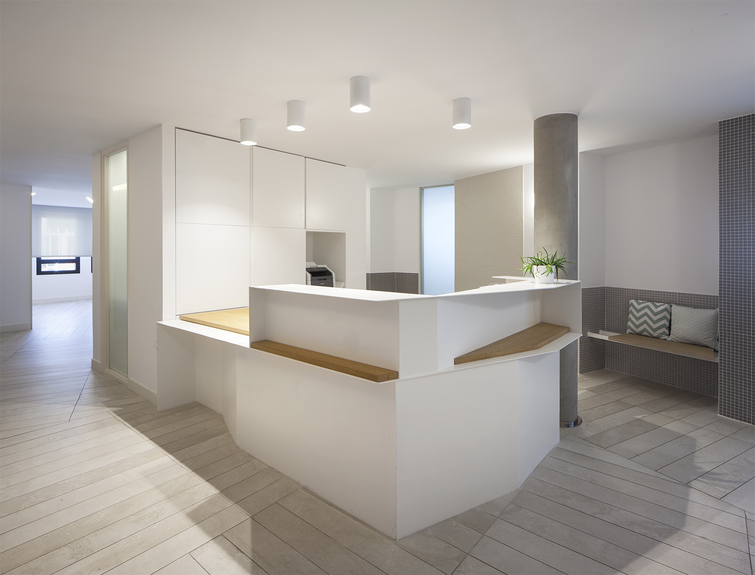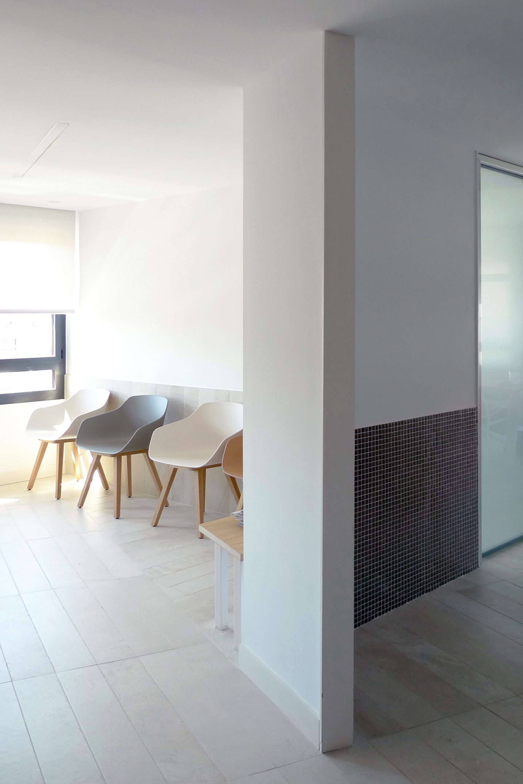 Esta aparente aleatoriedad geométrica sirvió como estrategia para separar los espacios principales del perímetro (sala de espera, tres consultas médicas y una sala de ecografía) de las zonas interiores, pero a la vez crear una serie de ámbitos de menor escala con un uso esporádico (cambiadores en el interior de las consultas, o bancos de espera hacia el distribuidor).