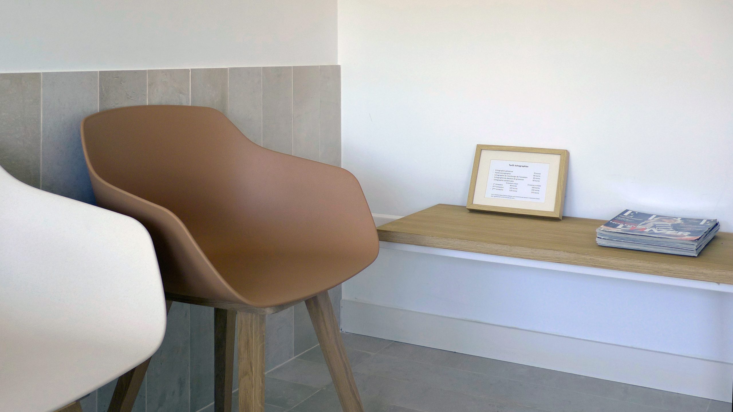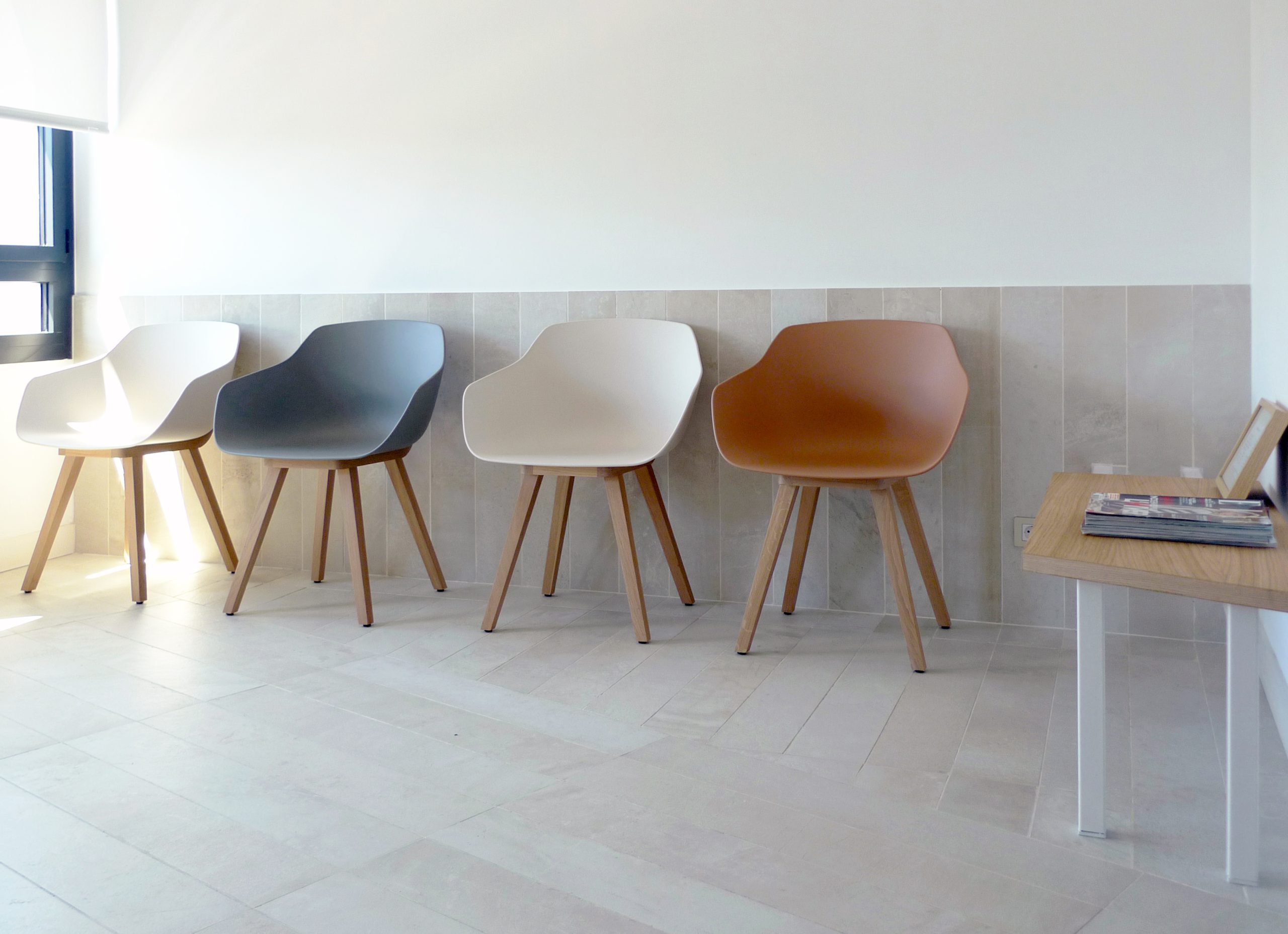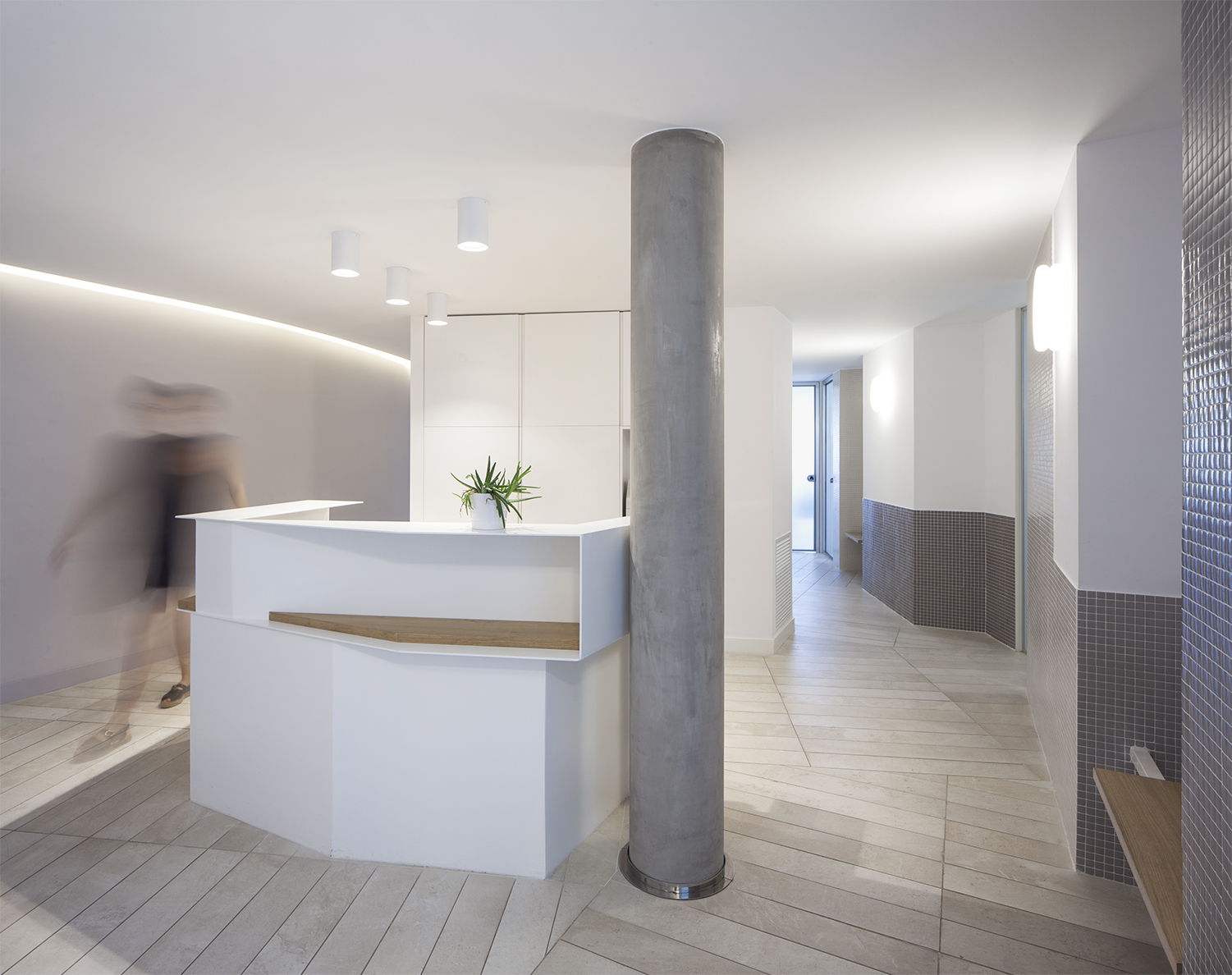 La escala de estos pequeños espacios y el uso de materiales normalmente asociados al mundo doméstico, como la madera o el mosaico, pretende dotar de calidez a las consultas y alejarlas del estereotipo de una clínica ginecológica como espacio clínico frío y aséptico.
