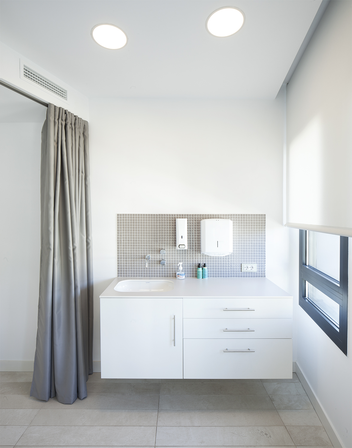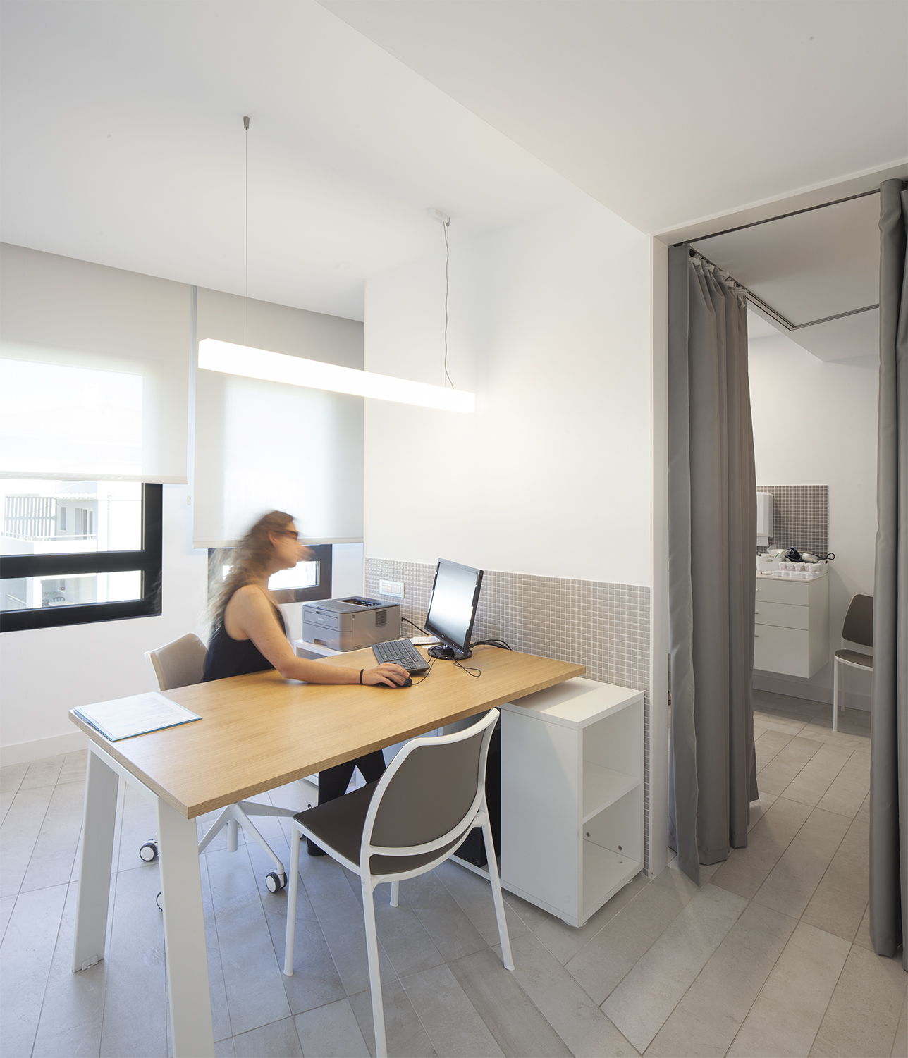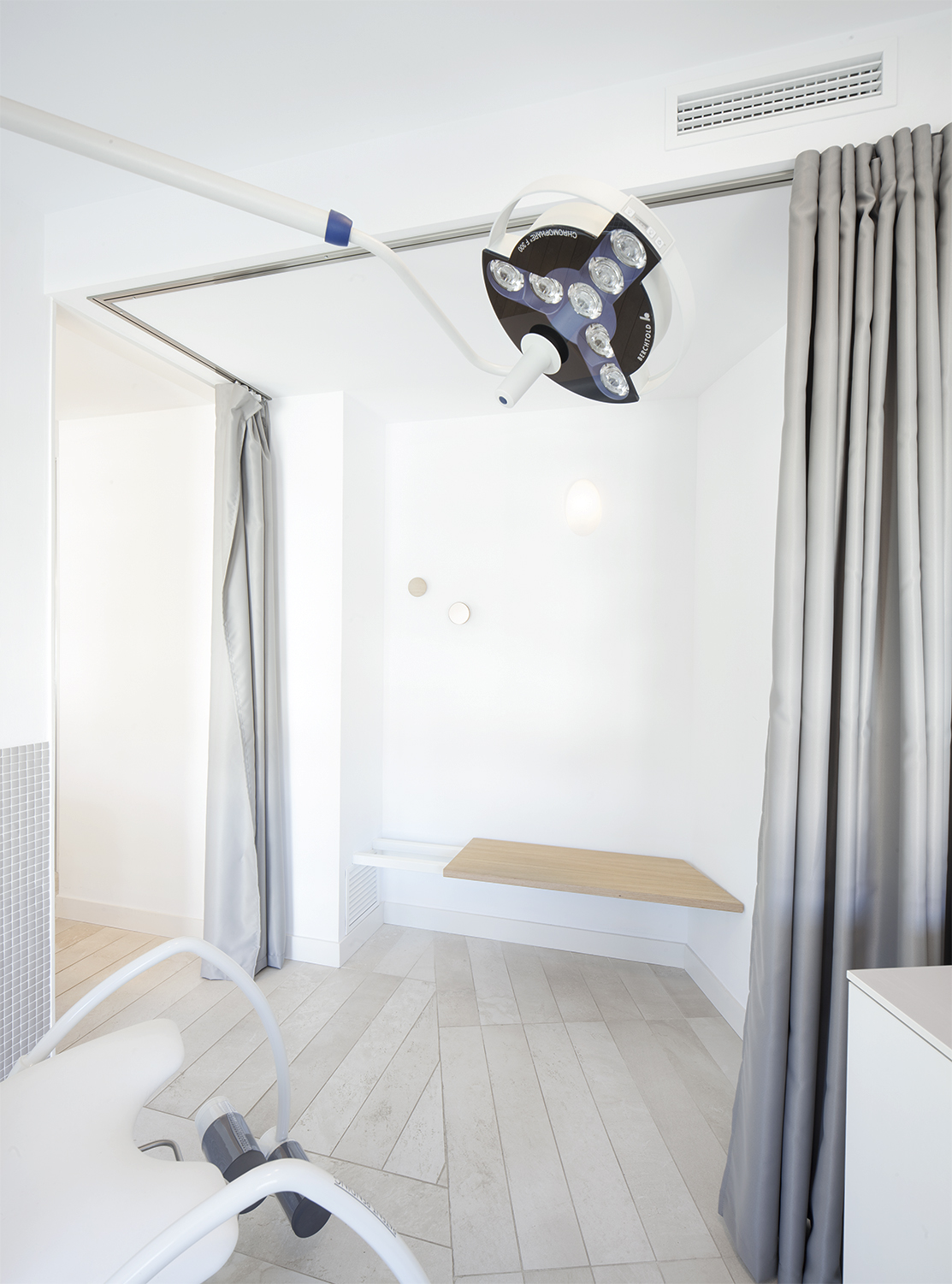 Dentro de las consultas se optó por compartimentar los diferentes ámbitos (zona de consulta, cambiador para la paciente y zona de examen médico) mediante un juego de cortinas para maximizar el espacio y hacer la experiencia más relajada.