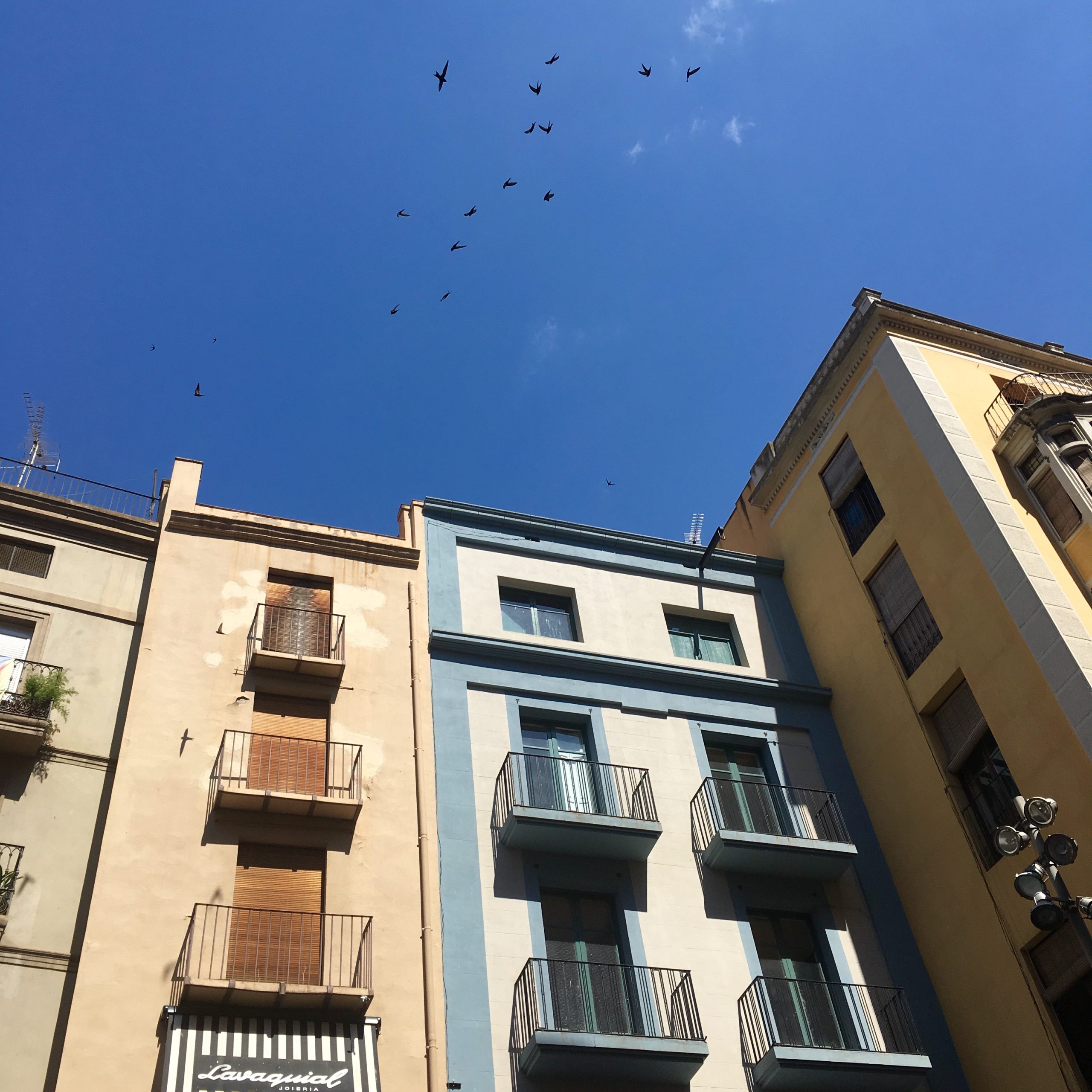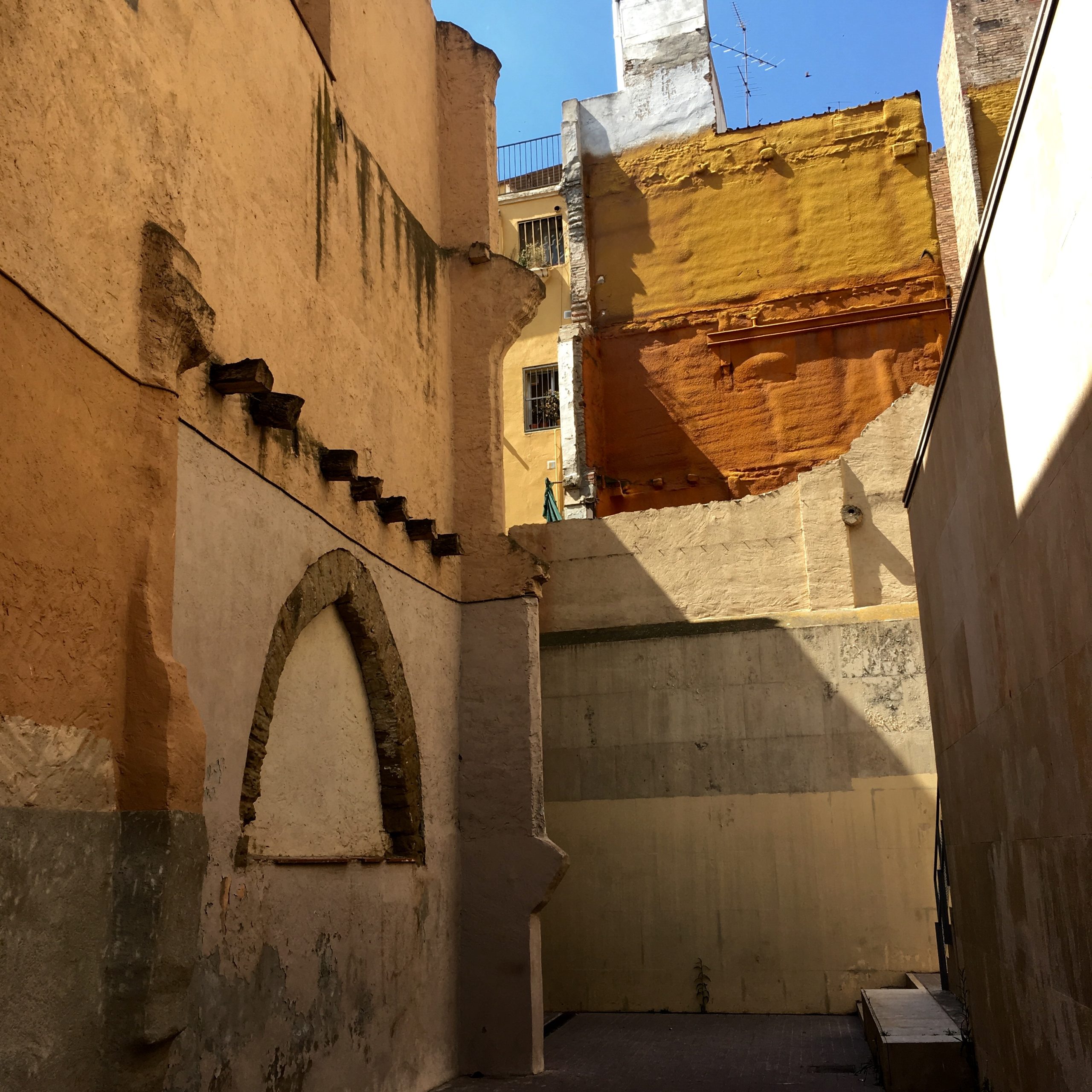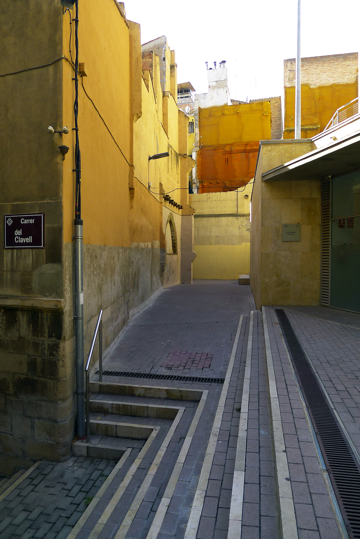 La fachada posterior, aparentemente ciega y orientada hacia la colina de la Seu Vella, nos muestra la superposición de estratos desde la edad media, con un arco ojival ahora tapiado, hasta la actualidad.