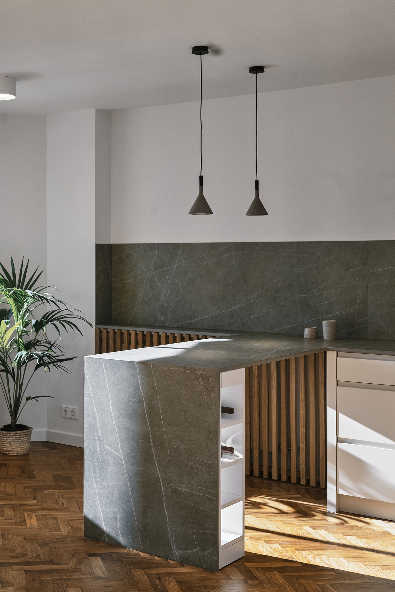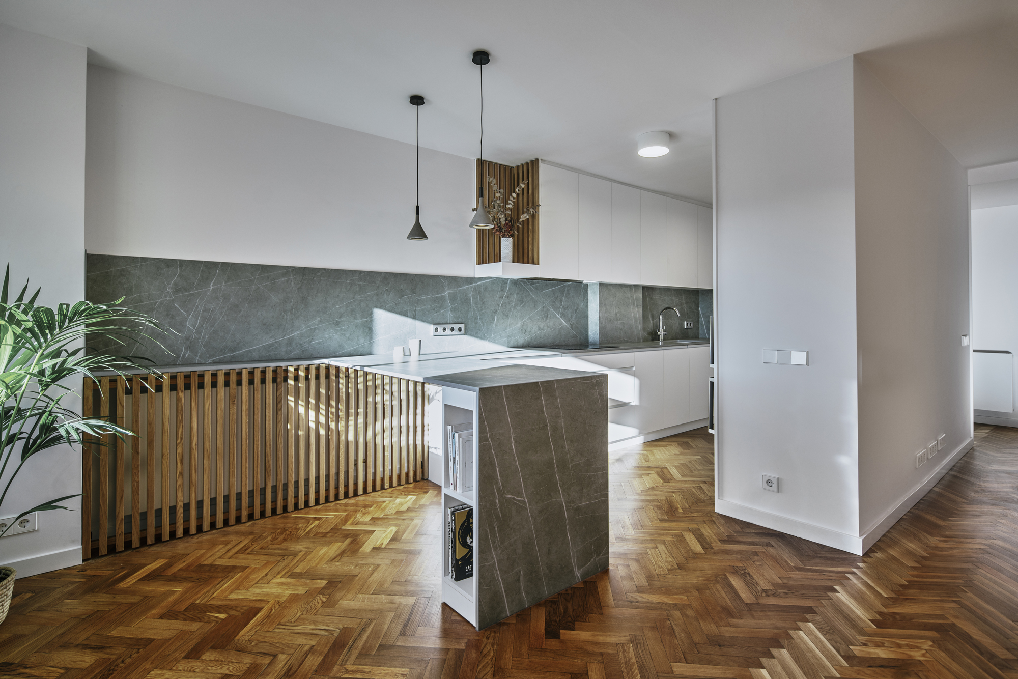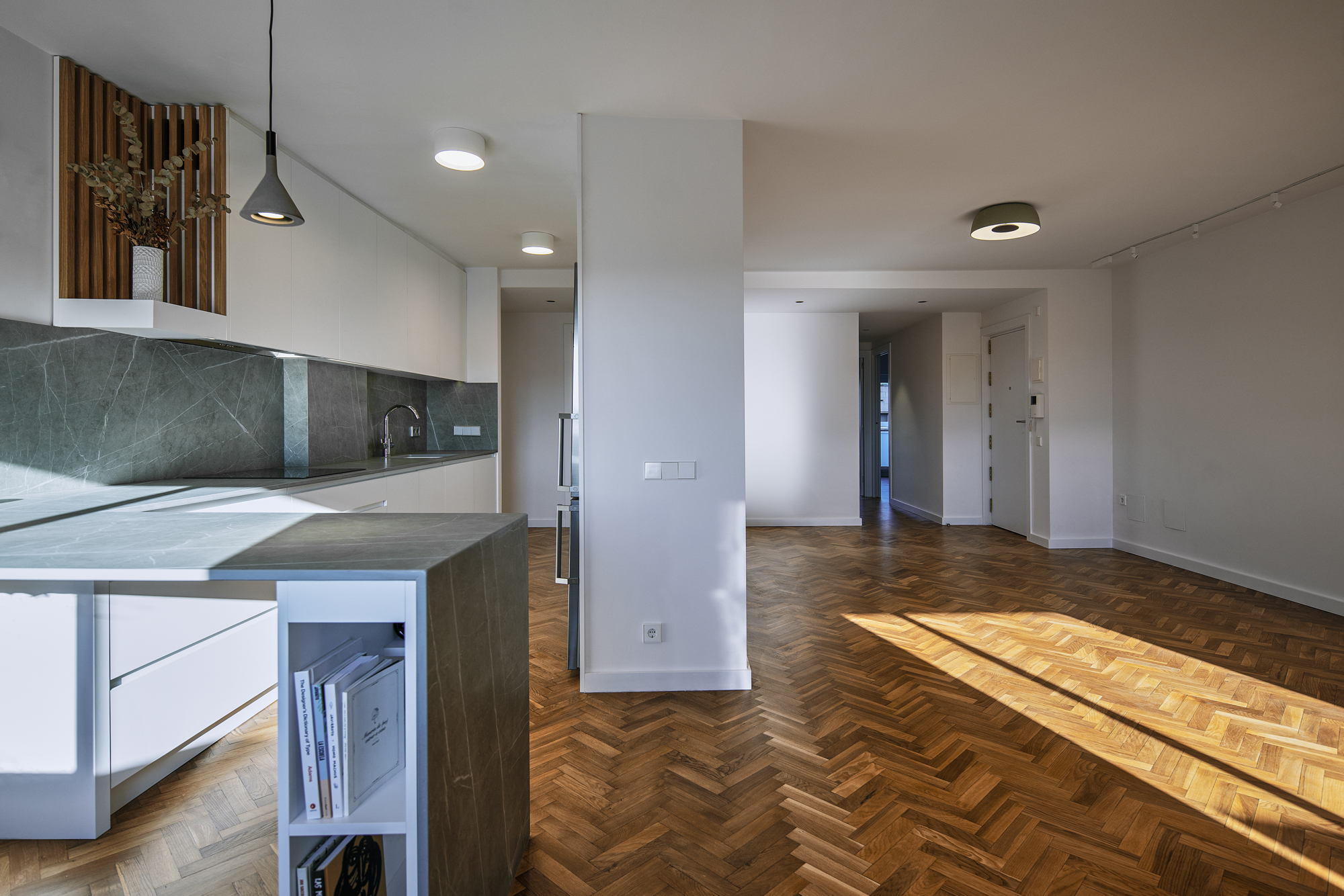 Se recuperó el suelo de tarima en espiga original, reponiéndolo donde fue necesario, y se utilizó la madera de roble y la piedra sinterizada como acabados destacados sobre el fondo neutro del conjunto.