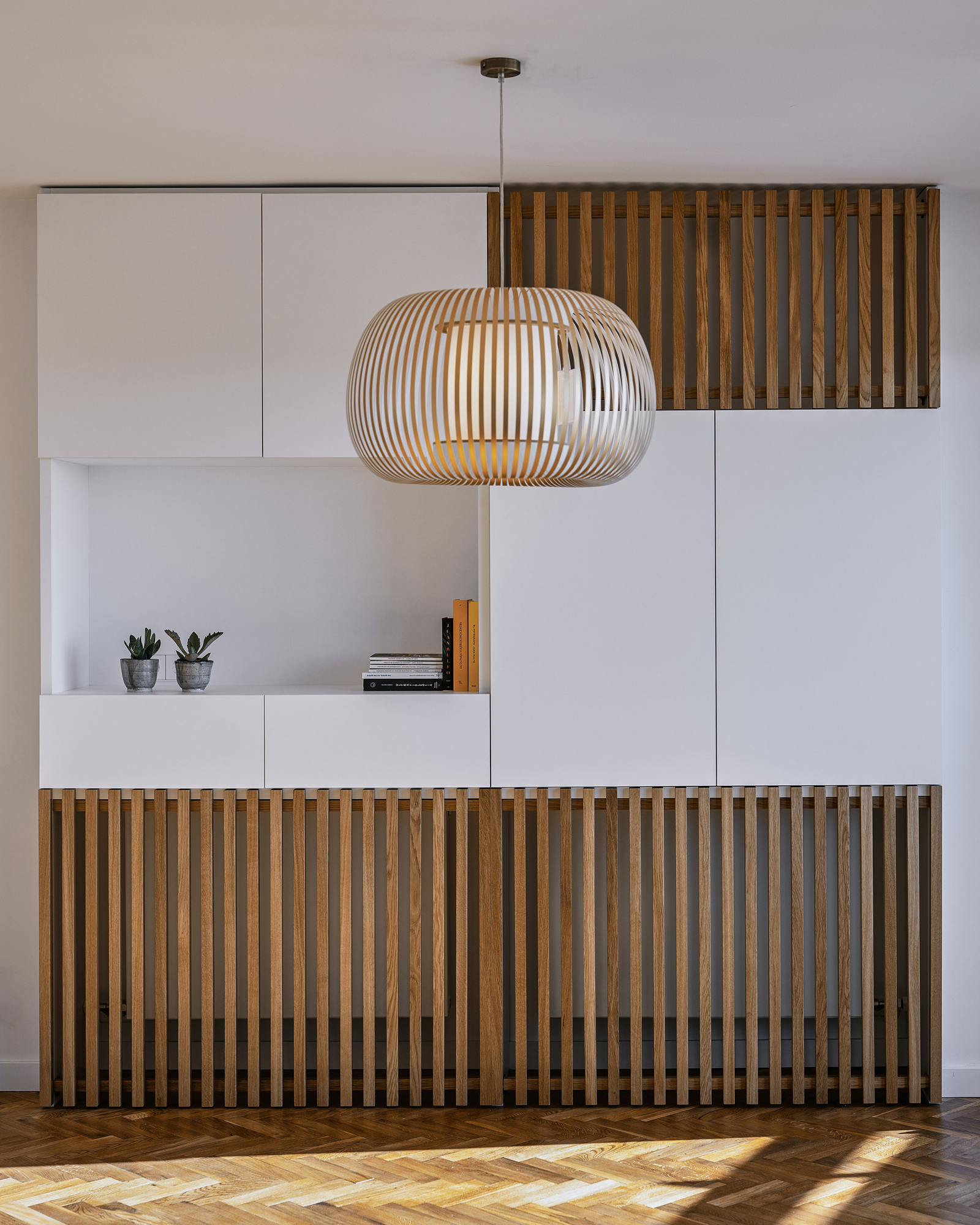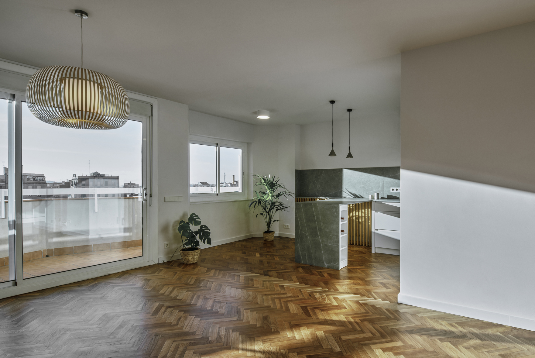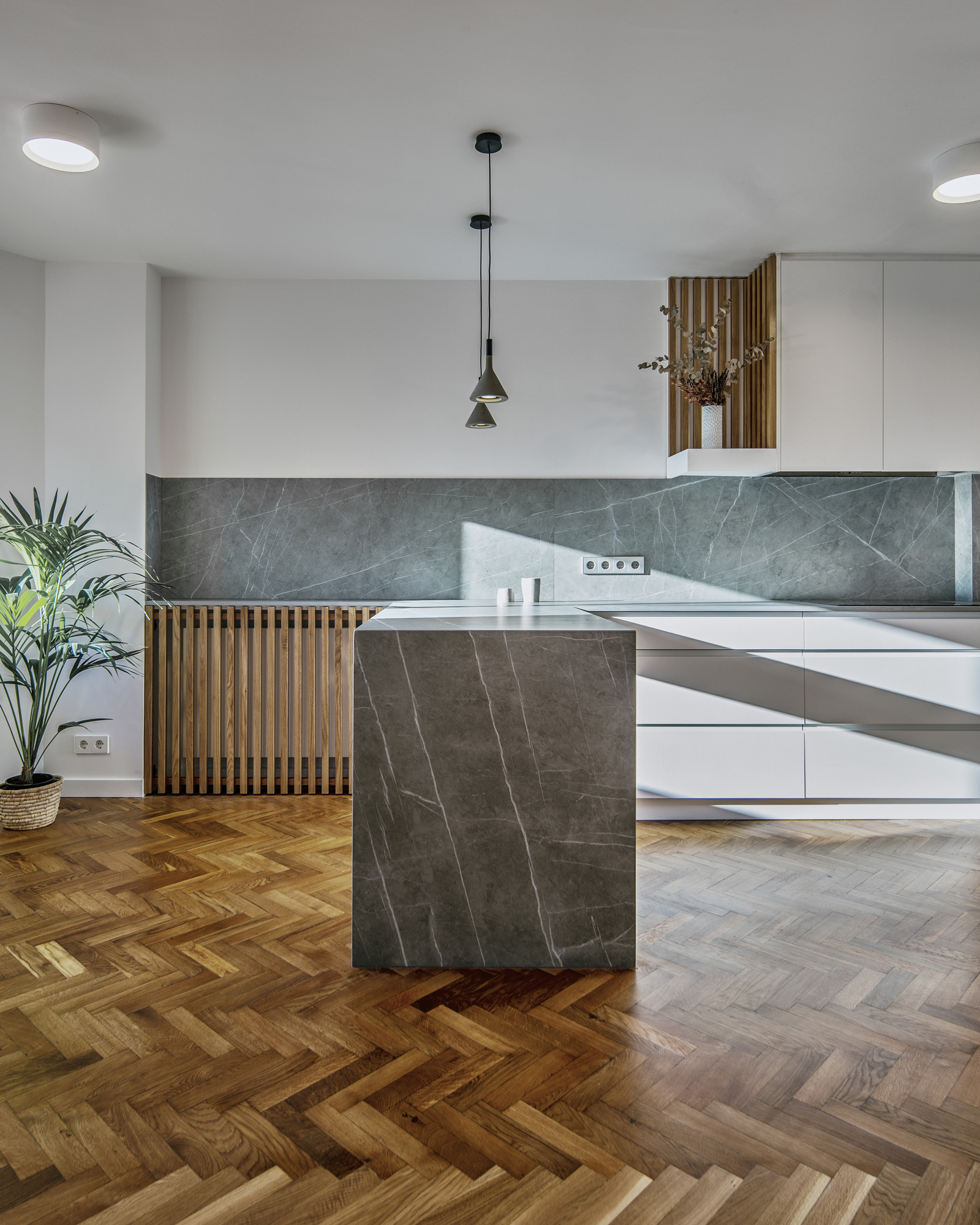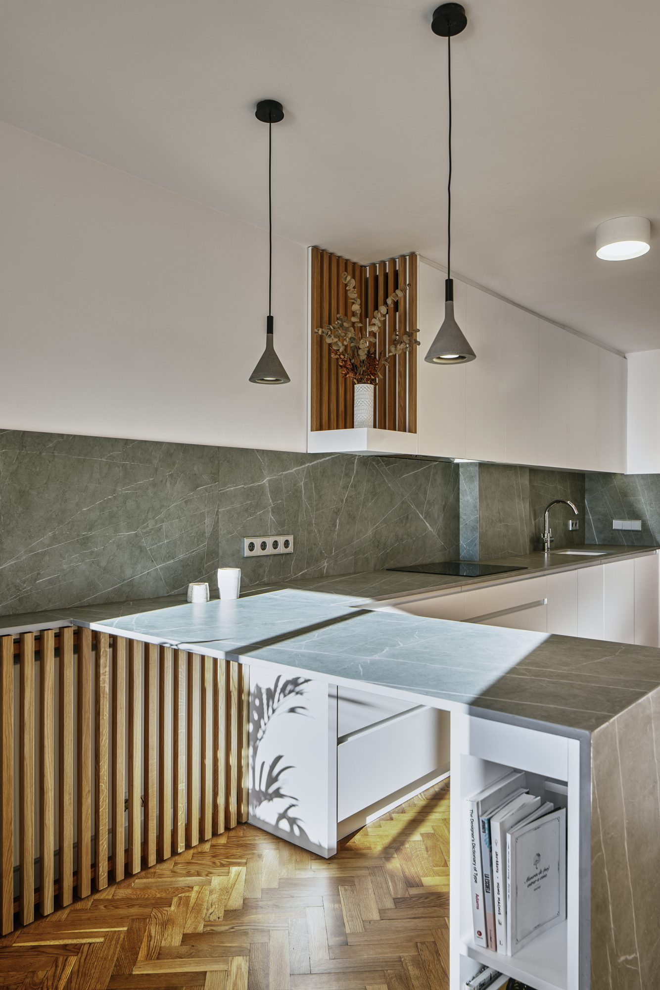 Se recuperó el suelo de tarima en espiga original, reponiéndolo donde fue necesario, y se utilizó la madera de roble y la piedra sinterizada como acabados destacados sobre el fondo neutro del conjunto.