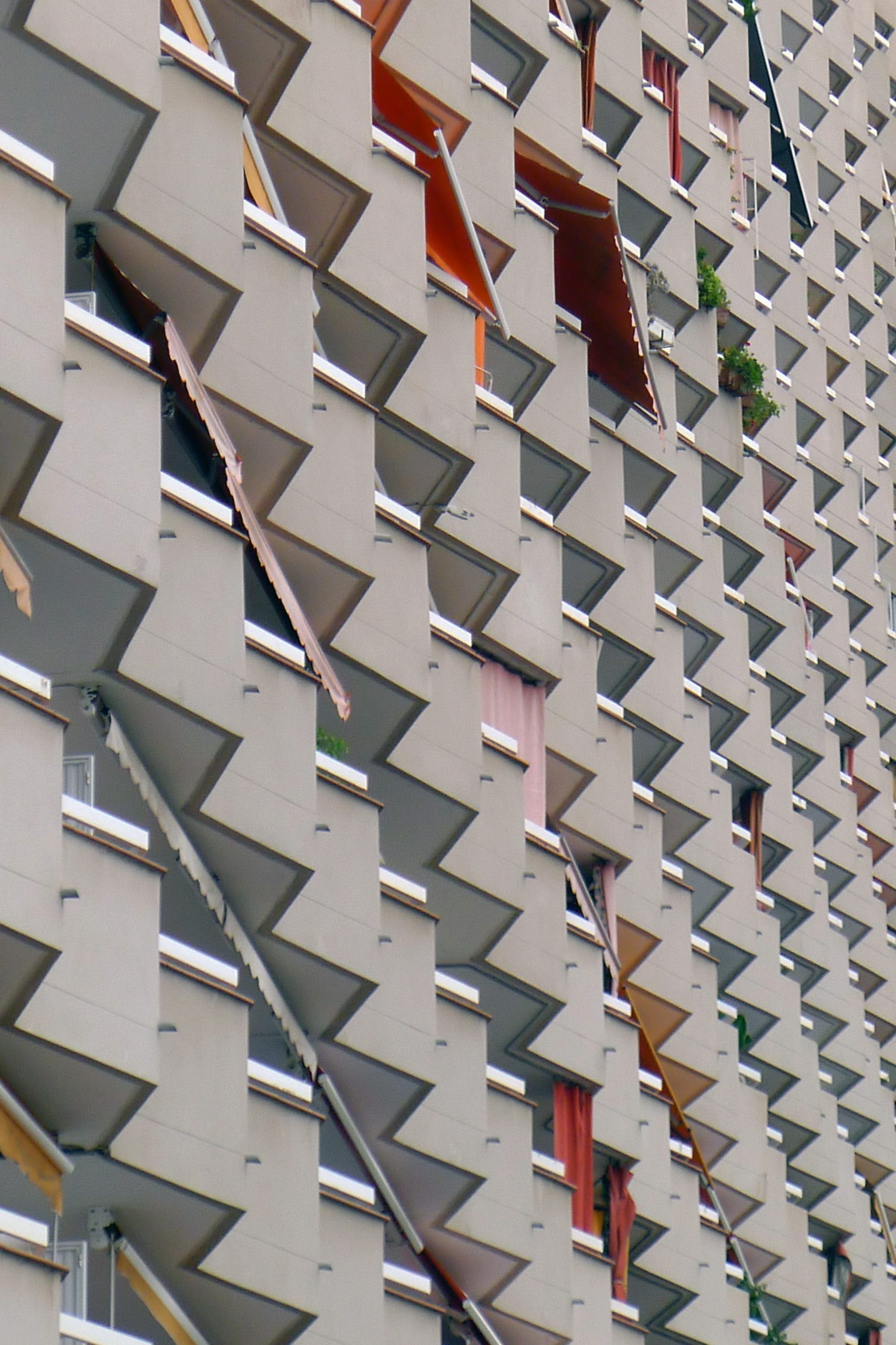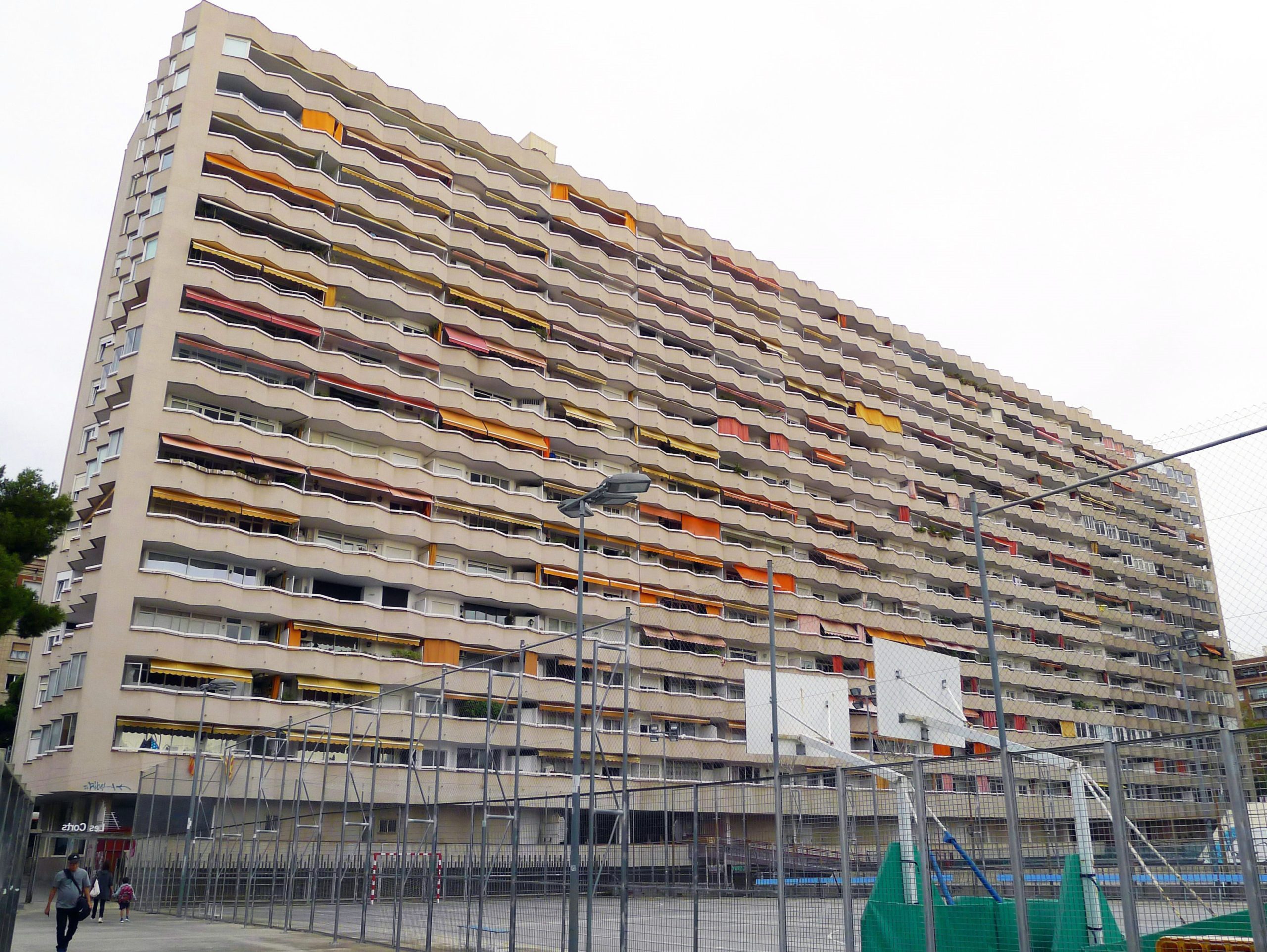 Se trata de un bloque de 240 viviendas, todas ellas pasantes y con terrazas corridas en ambas fachadas del edificio, con las zonas de servicio originalmente ubicadas en la fachada a Travessera y la zona de estar y dormitorio principal hacia el patio de manzana, con orientación sureste.